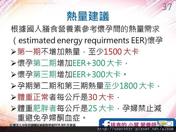 第37頁當中,科室對於孕期第一期建議熱量至少1500大卡與 孕期第二與第三期 熱量至少1800大卡的 討論結果是