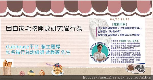 有間貓旅精品度假中心 有貓行為諮商師 曾麒穎 駐點。說起C.Y.貓先生跟小賀營養師的緣分起源於2021年4月10日在clubhouse平台 專訪 C.Y.貓先生,一位學法律到當出版社編輯,因為自家毛小孩的關係開啟了研究貓行為,而當天小賀原本只是協助專訪,結果主題房開始前的30分鐘被通知要當主key訪問 C.Y.貓先生,對於從來沒自己養過毛孩的我,可真是一大挑戰阿!整個場次下來,我說最多的字句就是『謝謝 C.Y.的分享!』其餘都是C.Y.自動自發地分享自己準備的資訊,甚至於還自己負責現場夥伴的提問的場控 ^^