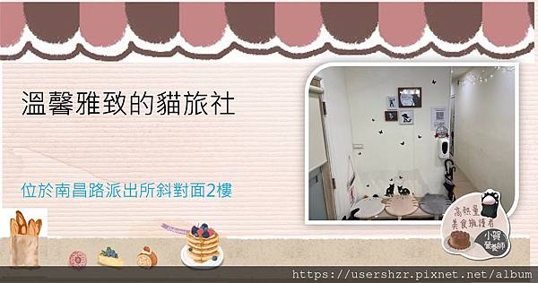 位於中正區南昌路一段14號2樓的貓旅舍有溫馨雅致的布置,鞋櫃上有貓造型的坐墊,牆壁布置也有貓咪