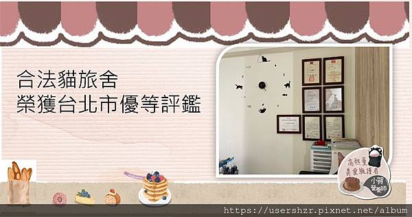 進入貓旅舍的左手邊牆面有一個貓造型的時鐘,還有各張證書與榮獲台北市優等評鑑的榮耀證明。