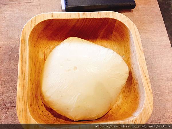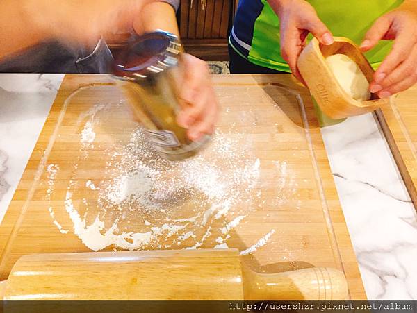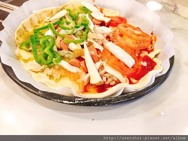 第四步:將面皮放入容器裡,開始配置,首先抹上醬料與灑上喜愛的配料,最後灑上起司條