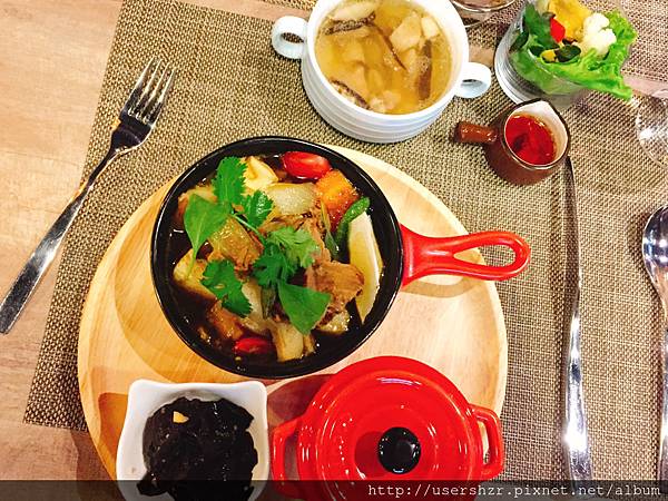 火鍋的湯頭偏死鹹,沒有很對小賀挑食的味蕾,不過我本來就沒特別愛喝湯啦,所以問我的意見,可能不是那麼客觀。但是那雞腿肉的份量確實在視覺效果上是令人開心的。店員特別推薦那一小碟的沾醬,與清淡的火鍋湯底相較之下,食材沾醬吃也真的比較好吃。